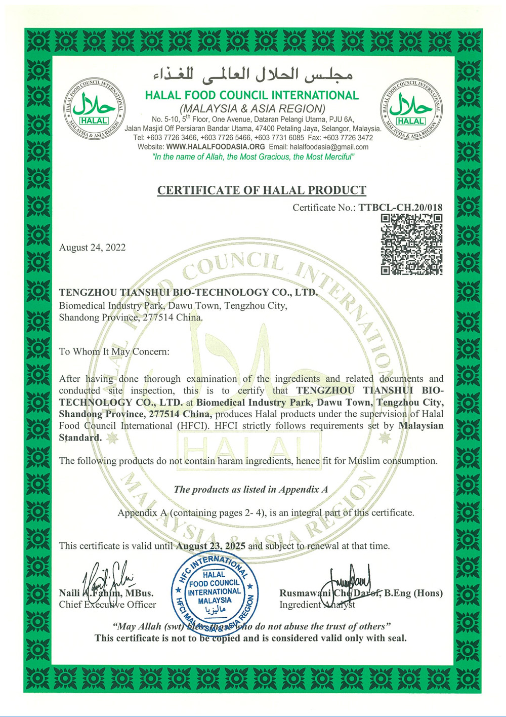 滕州市天水生物科技有限公司成立于2011年9月,是目前國內雜環類合成食品香料、日化香料和醫藥中間體生產經營的綜合性企業。坐落于山東省滕州市生物醫藥產業基地,總投資5000余萬元,占地面積約30000平方米,員工百余人。公司先后被評為高新技術企業、專精特新中小企業、科技型中小企業,建有市級重點實驗室1處,并先后獲得ISO9001質量體系認證、ISO22000食品安全體系認證、kosher認證和Halal認證。是香精香料及食品配料協會會員單位及滕州市中小企業協會理事單位。